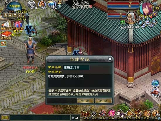 1、到长安城中(198,244)找帮派总管张震阎对话,选择“我要创建帮派”。