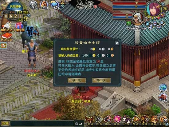 4、为了吸引玩家前来响应,申请人可以设置帮派响应金,响应金最低为10金,当帮派成功创建,这笔响应金就会平均分发给前来响应的玩家。响应要是失败,响应金会归还创建者。