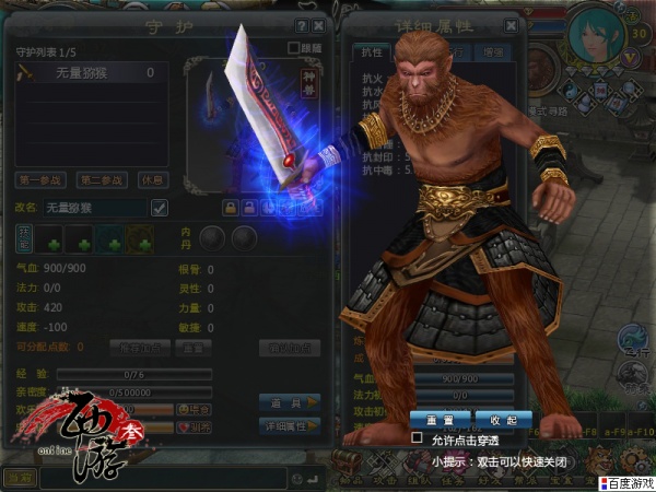 无量猕猴属性初值:气血900,法力0,攻击420,速度-162,成长率0.618