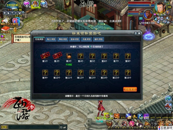 1、新建角色登陆后,达到一定的在线时间,便可以打开主界面右上角“丰富奖励”界面的“在线奖励”领取礼包奖励。